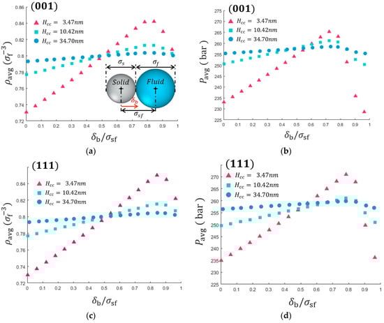Effects of the defined solid/fluid boundary on the average thermodynamic properties of confined fluid. The average density with respect to the defined solid/fluid boundary of Ag-Ar contact plane of (a) (001) and (c) (111). The average pressure as a function of solid/fluid defined boundary for (b) (001) (d) (111) contact planes.