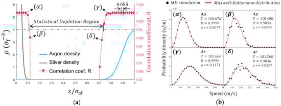 The local thermodynamic equilibrium near the solid/fluid boundary is tested using MD simulation. The slab bins are divided into 0.05 Å intervals, which is small enough to capture the full resolution of the structural inhomogeneity. The local thermodynamic equilibrium must be satisfied to use the mathematical relations of thermodynamic properties driven from statistical mechanics []. This can be tested by comparing local velocity distributions to the Maxwell-Boltzmann distribution and quantified by the correlation coefficient. The atomic velocity of the slab bean is collected for 200 ns, which is a relatively long time considering the typical data acquisition time of 2 ns. As shown in Figure 5a, the nucleus of solid and fluid atoms can occupy and as a result of the thermal motions and interactions between solid and fluid molecules. The correlation coefficient, R, represents how well the velocity distribution of MD simulation matches with Maxwell-Boltzmann distribution indicating a perfect match for R = 1 and no correlation for R = 0. Near the edge of the thermal oscillations, the statistical significance is rapidly broken (see Figure 5b). Statistical Depletion Region (SDR) is defined on the basis of 99% correlations as depicted in Figure 5a. The range of SDR can vary with the thermodynamics states and molecular characteristics as it is closely related to the density distribution. It is speculated that the solid/fluid boundary is located at the SDR where no nucleus occupies. SDR is occupied by electrons and an explicit investigation of electrons in SDR must be carried out by quantum mechanical methods. It is noted that the effect of electrons is implicitly considered by LJ potential in this study.