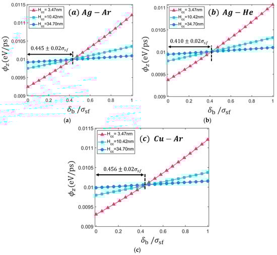 Figure 6 shows the calculated heat flux with respect to for Ag-Ar, Ag-He, and Cu-Ar system at 300 K. The calculated heat flux increases as the boundary definition shift to the liquid region. The relative difference between the calculated and the given heat flux is between −8% to +12% within shifting. This observation confirms the importance of the definition of the solid/fluid boundary for the quantitative analysis of heat transport. 0.01 eV/ps heat flux is archived at approximately = 0.445 for Ag-Ar interface regardless of the channel heights. This result agrees with the location that recovers the local viscosity near the wall (i.e., = 0.44) report by Kim et al. []. In the case of Ag-Ar interface at T = 100 K, this location of solid/fluid boundary can considerably reduce the discrepancies of average density from 7.94% to 1.89% and average pressure from 8.81% to 1.75%. It is noted that the difference of LJ diameter of Ar and He is approximately 29%, but the estimated boundaries show only 9% difference (See Figure 6a,b) when it is normalized by . Similarly, the LJ diameter of Cu and Ag show 13% difference but the estimated boundary shows about 2% difference (See Figure 6a,c). This result implies that the LJ diameter of solid-fluid pair is one of the key factors for solid/fluid boundary. This variation of heat flux affects the estimation of thermal conductivity using Fourier’s law (so-called direct method [,]). Then, not only quantitative analysis but also qualitative analysis can be disturbed by boundary definition. The two boundary definitions and lead to two contradicting conclusions on size effects of the thermal conductivity: as the channel size increase, the thermal conductivity increases () or decreases () (See Figure S1).