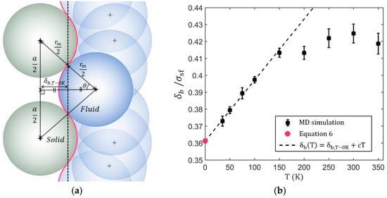 The solid/fluid boundary location is calculated with LJ potential, the lattice constant of FCC (Face Centered Cubic) crystal by ignoring thermal motion. It is known that monoatomic fluid molecules adjacent to the FCC (001) surface forms another layer of the FCC-like structure to minimize the energy []. If the thermal energy is very small, the fluid atoms may form a perfect FCC structure near the surface as shown in Figure 7a. The solid/fluid boundary is represented as the red line that has a three-dimensional corrugation pattern (See Figure S2). For simplicity, the solid/fluid boundary is assumed as a plane in this work. Then, the averaged location of solid/fluid boundary can be described as follows: