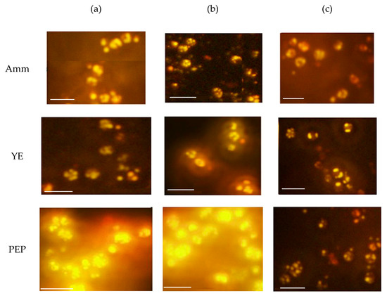 Microscopic examination of yeast cells stained with Nile red fluorescence dye. Yeast cells were grown in different nitrogen sources, Ammonium sulfate (Amm), yeast extract (YE), and peptone (PEP) with different C/N ratios: (a) 146, (b) 94, and (c) 70 for six days. The magnification bar is equal to 10 µm.
