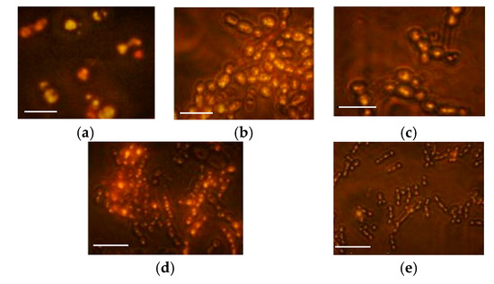Microscopic examination of yeast cells stained with Nile red fluorescence dye. Yeast cells were grown in a shaken flask under different Al2(SO4)3 concentrations using the optimized medium as a control, with C/N equal to 146 (using ammonium sulfate as a sole nitrogen source) and C/S equal to 120, at 180 rpm and at 28 °C for six days. (a) Control. The Al2(SO4)3 concentrations were (b) 0.1 mM, (c) 0.3 mM, (d) 0.7 mM, and (e) 1 mM. The magnification bar is equal to 10 µm.