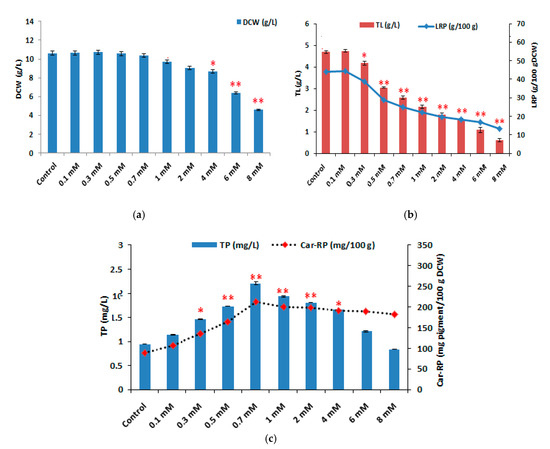 The effect of different Al2(SO4)3 on DCW, TL, and TP production by R. glutinis after six days is described in Figure 4. First, the growth in the control was around 10.6 g/L and remained almost steady above 10 g/L till 0.7 mM, after which, the growth gradually decreased with increasing Al2(SO4)3 concentrations up to 10 mM, at which no growth was observed, and the effect of aluminium was statistically significant at 4 mM and highly significant at 6 and 8 mM compared with the control (Figure 4a). Contrary to the studied yeast strain, another study carried out on Rhodotorula taiwanensis RS1 found that RS1 is a high-aluminium (Al)-tolerant yeast that can survive in Al concentrations up to 200 mM [52].