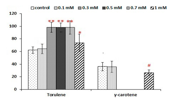 The percentage of individual carotenoids, γ-carotene and torulene, in the carotenoid profile extracted from Rhodotorula glutinis. Yeast cells were grown in a shaken flask under different Al2(SO4)3 concentrations in the optimised media using optimised media as a control. The data are the mean of two repeat tests, and the standard deviation was calculated and represented as an error bar. Asterisks ** represent a statistically significant difference between the single-Al-treated group and control at p ≤ 0.01 in the case of torulene, and hash # represents a statistically significant difference between the single-Al- treated group and control at 0.01 < p ≤ 0.05 in the case of γ-carotene.