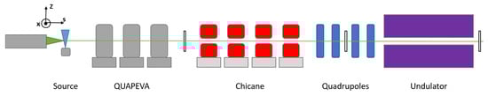 Figure 1 shows the sketch of the COXINEL line. Electrons were produced and accelerated by a Titanium:Sapphire laser focused on a gas jet. A triplet of permanent magnets quadrupoles with tunable gradient (QUAPEVA [57,58]) positioned 5 cm from the source handles the bit of mrad initial divergence of the electron beam via a strong magnetic field, insuring a proper beam focusing. Then, a demixing chicane consisting of four electro-magnetic dipoles accompanied with a removable and adjustable slit placed in the middle stretches the beam longitudinally, sorts electrons by energy, and then selects the energy of interest via the slit. A second set of four electromagnetic quadrupoles (EMQs) enables a beam to focus into a cryo-ready undulator of 107 periods. In addition, scintillating screens enable measuring the beam size and shape at different locations along the line [67]. The coordinate system shown in Figure 1 uses x as the horizontal direction, z as the vertical one, and s as the longitudinal one.