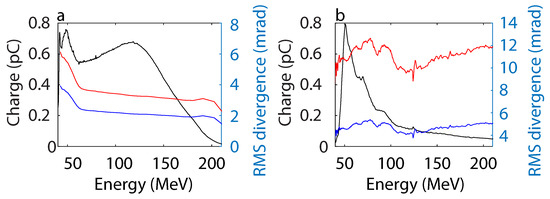 Typical beams are generated in a 50–300 MeV range, with 1.5–5 mrad (RMS) vertical initial divergence. The total beam charge is up to 200 pC distributed over the entire electron energy range. However, the energy range of interest is 176 ± 0.1% MeV (corresponding to an inhomogeneous bandwidth inferior to the natural bandwidth of the first harmonic [81]) where only a small fraction of the charge is contained. Figure 2 presents the measured beam energy distribution and divergences: low (Figure 2a) and high divergence (Figure 2b). Both cases differ in terms of the initial vertical divergence (2 versus 5 mrad), divergence ratio (1.56 versus 2.35), and charge density (at the energy of interest close to 0.3 pC/MeV vs. 0.1 pC/MeV). Both energy distributions span over a broad range of energies, which translates into a huge energy spread. Thus, with the necessity of the chicane with a slit, the transport line is set up so the energy of interest 176 MeV is perfectly transported and most of the other energies will be cut at the slit. Consequently, most of the beam charge is lost, while the charge of 176 MeV will be transported. The shot-to-shot pointing variation on the first beam imager for the data set of Figure 2a is 2.62 mrad in the horizontal direction and 0.49 mrad in the vertical direction. , = 0.2 mm mrad and the initial bunch lentgh = 1 m (Table 1) has been extracted from the LPA particle in cell (PIC) simulations of the source setup used.