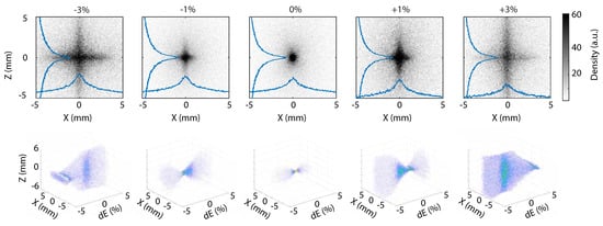 Electron beam transverse shape (top) and corresponding vertical–horizontal position per energy (bottom) at the undulator exit for the relative gradient change of QUAPEVA 2 of ±3, ±1, and 0%. Case of “undulator entrance” optics with the low divergence beam distribution (Figure 2a and Table 1), , = 0.2 mm.mrad, mrad, mrad.