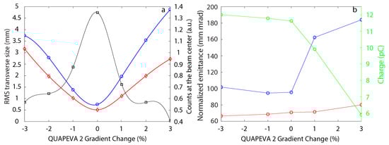 (a) Horizontal (⋄) and vertical (∘) RMS beam size and counts at the center of the beam (□) for the “undulator entrance” optics (each point averaged over 5 repetitions of the simulation) and (b) beam vertical (∘) and horizontal (∘) normalized emittance and total charge (∘) at the undulator center for the optics ’undulator’, for the relative gradient change of QUAPEVA 2 using the low divergence initial beam distribution (Figure 2a and Table 1) with mrad, mrad, and = = 0.2 mm.mrad.