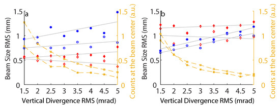 Counts at the center of the beam (□), horizontal (⋄), and vertical (∘) beam RMS size versus initial divergence for the low (void symbols) and high (filled symbols) skew (Table 2) for the electron distribution of Figure 2a, Table 1, (a) before and (b) after the undulator with the “undulator-entrance” optics and “undulator-exit” optics, respectively. Each point averaged over 5 repetitions of the simulation.