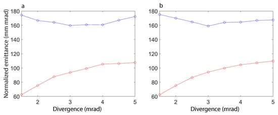 - Migliorati, M.; Bacci, A.; Benedetti, C.; Chiadroni, E.; Ferrario, M.; Mostacci, A.; Palumbo, L.; Rossi, A.R.; Serafini, L.; Antici, P.; et al. Intrinsic normalized emittance growth in laser-driven electron accelerators. Phys. Rev. Spec. Top. Accel. Beams 2013, 16, 011302. [Google Scholar] [CrossRef]