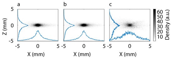 In the case of a low initial divergence electron beam (see Figure 2a, Table 1) for an ideal quadrupole ( = 0), the RMS beam size is 0.52 ± 0.02 mm and 0.80 ± 0.10 mm horizontallly and vertically, respectively (see Figure 9a). When a small skew quadrupole term (Table 2) is added (Figure 9b), the beam remains well centered and focused (RMS beam size of 0.52 ± 0.05 mm and 0.72 ± 0.08 mm horizontallly and vertically, respectively). For high (Table 2) (see Figure 9c), the beam exhibits a tilted cross shape, resulting from the change of gradient angle (see Equation (3)).