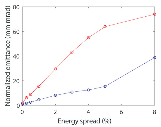 Figure 13 shows the horizontal and vertical emittance at the undulator center of an initial flat-top energy distribution electron beam versus energy spread. From the monochromatic beam ( = 0) to =5% energy spread, the emittance has a linear dependence versus energy spread, as shown in the chromatic term (see Equation (2)), with a slope of 12.4 mm.mrad/% (2.9 mm.mrad/%) in the horizontal (vertical) plane. () increases to 63.8 mm.mrad (15.3 mm.mrad) for a = 5% spread. For larger than 1%, the chromatic emittance starts to dominate. For higher than 5%, starts to converge around 74 mm.mrad and to increase faster, because the lower and higher energies vertically defocus at the undulator and are thus cut by its physical aperture.