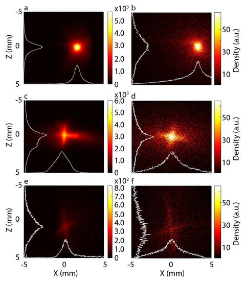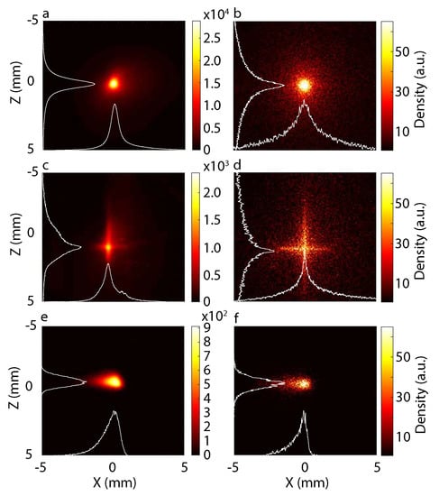 Transverse beam shape at the undulator entrance: measurements (a,c,e) and simulations (b,d,f) with the low skew case (Table 2), mrad and mrad, , = 0.2 mm.mrad. (a,b) “Undulator entrance” optics, QUAPEVA 1: 103.27 T/m, QUAPEVA 2: −115.65 T/m, QUAPEVA 3: 94.94 T/m, (c,d) QUAPEVA 1: 103.27 T/m, QUAPEVA 2: −121.99 T/m, QUAPEVA 3: 94.94 T/m. (e,f) With the “slit-undulator” optics, a horizontal pointing of 5 mrad and the slit in the chicane closed at 1 mm (177 MeV). Shot-to-shot pointing for (a,c,e): 0.005 ± 0.01 mrad, −0.09 ± 0.06 mrad, and 0.17 ± 0.49 mrad (0.03 ± 0.02 mrad, 0.10 ± 0.08 mrad, −0.18 ± 0.01 mrad) in the horizontal (vertical) direction.