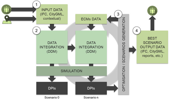 - Scenarios generation and optimisation process (3). Once the baseline is calculated, the tool generates a set of candidate retrofitting scenarios based on implementing Energy Conservation Measures to the baseline model. These models are then calculated through the simulation tools integrated into the tool and provide the indicators that characterise their performance. Groups of scenarios are generated and evaluated until the stopping criteria are met.