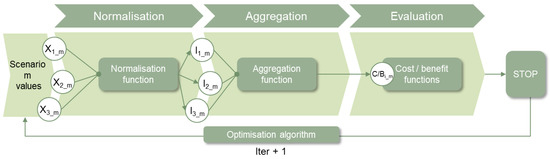 The solution proposed by this evaluation methodology is the one reflected within Figure 2 above. This process considers first the normalisation of the evaluation criteria in order to make them comparable, then an aggregation method is implemented to calculate two functions: the one representing the cost, and the one reflecting the benefit, which allows ordering the scenarios and comparing them to select those most suitable to the targets defined by the user.