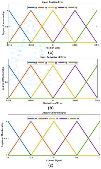 Membership functions (MF) used for inputs and output data: (a) Position error (input), (b) derivative of error (input), (c) control signal (output).