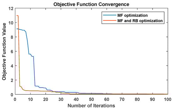 For purposes of comparison, both optimization procedures: For MF and RB, and with only MF have been implemented. On one hand, the optimization process of MF and RB took approximately 8 h on an Intel(R) Core(TM) i7-4510U CPU (2.00GHz) 12 GB of RAM computer using Matlab® program (Matlab 2016b, MathWorks®, Natick, MA, USA, 2016), whereas most of the computation time is spent on solving the 40 iterations required to reach the optimum solution that minimizes the objective function according to the problem restrictions. On the other hand, the optimization process of only MF took approximately 12 h on in the same simulation platform, whereas most of the computation time is spent for solving the 60 iterations required to reach the optimum solution that minimizes the objective function according to the problem restrictions. In this regard, Figure 5 illustrates the average objective function convergence for ten runs of each algorithm showing that optimizing MF and RB may lead to a faster convergence speed of the optimization process.