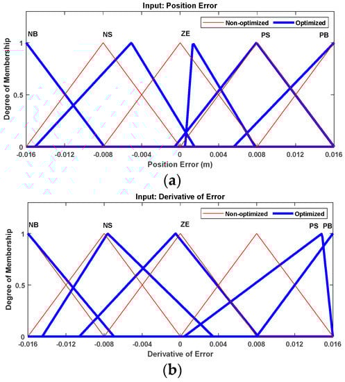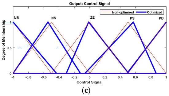 Optimized and non-optimized MF used for inputs and output data: (a) Position error (input), (b) derivative of error (input), (c) control signal (output).