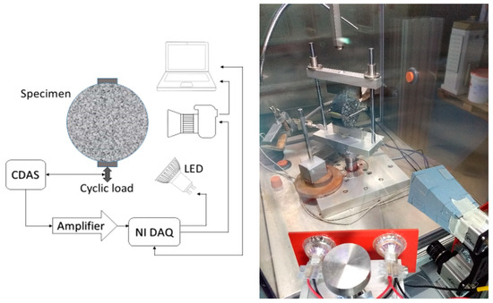The camera used in this research was a GigE uEye UI223xRE-M IDS, with a resolution of 1024 × 768 and frame rate of 30 fps in full resolution. The camera was aligned with four LED spots to generate the proper lighting condition in the images (Figure 2). The load signal was measured by the Pavetest’s compact control and data acquisition system (CDAS) and amplified using an AM 502 differential amplifier and sent to the national instrument NI USB-6343 Multifunction DAQ, as a trigger signal. Using this signal, camera and LED spots were triggered at the desired cycles of the experiment to capture the images. Moreover, the camera captures images with a 20 ms delay after receiving a pulse; therefore, to have a perfect synchronization between the camera and LED spots, the camera was triggered 20 ms before the LED spots. The camera was focused manually and the exposure time was set to 18 ms in order to have the optimum brightness in the images. The camera was calibrated using an AI-08-BMB_9*9 Dantec Dynamics calibration plate and the Istra 4D software. Using the Istra 4D software it was possible to determine the projection parameter and take any distortion of the imaging or tilting of the object into account. For each specimen, first, one image was captured before the experiment starts as a reference image. Then, depending on the total duration of the fatigue tests, approximately 100 images were acquired using a logarithmic relation between the number of images and number of cycles so more images are captured at the end of the experiment when the cracks propagate faster. Finally, 1080 images were captured during the 18 h rest time (one image per minute). Figure 2 shows the experimental set up of the measurements. Only the top camera of this system is active in this research. Moreover, to avoid any unwanted light reflection on the glass of the UTM the whole system was covered with a black plastic cover.