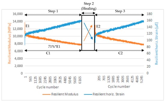 C1 and C2 are numbers of loading cycles, and E1 and E2 are the averages of the resilient modulus for the first 100 cycles of each step of the test. As explained in the introduction, these recoveries are not only due to the healing phenomenon and include recoveries based on other mechanisms as well.