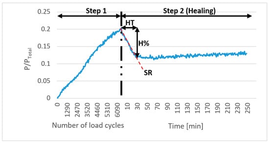 Next, the diagrams of P/Ptotal are plotted for the samples during the first and second step of the experiments (Figure 9). Based on these diagrams and with the procedure explained in Section 2.3, the healing parameters of the samples based on the DIC method are calculated and presented in Table 3. In this table, it can be seen that the average of RI for this mixture is 97%, but the H% value is only 27.7%. Therefore, it could be concluded that strain recovery on the surface does not fully represent the recovery of the mechanical properties of the mixtures. This difference could be due to the fact that H% only investigates the healing of the microcracks on the specimens, but some viscoelastic responses such as non-linearity, thixotropy, and steric hardening can also generate mechanical recovery during the second step of the experiments. Furthermore, H% is based on the microcracks on the surface of the objects. However, healing occurs as well in the microcracks under the surface layer. This can explain the high standard deviation value for H%. The two more interesting calculated parameters are HT, which indicates the time in which all the strain recovery on the surface of the mixture happens, and SR, which shows the speed of this recovery. Without DIC, multiple experiments with different healing times should be conducted to estimate the required healing time for a mixture to achieve its optimum recovery level. However, in this research, the healing level of the asphalt mixture was plotted in time with only one experiment. This diagram was able to give the minimum time (29.33 min) to have the optimum healing for this asphalt concrete in an efficient procedure. This could be useful in practice to decide how much time a mixture needs to heal to an optimum level at a certain temperature. It is also possible to use this method to calculate the SR of different asphalt mixtures and compare their healing rates. However, it should be mentioned that HT and SR are not only dependent on the mixtures but also the temperature increase rate. Thus, they can only be used to compare different mixtures if the exact same healing procedure (step 2) is conducted.