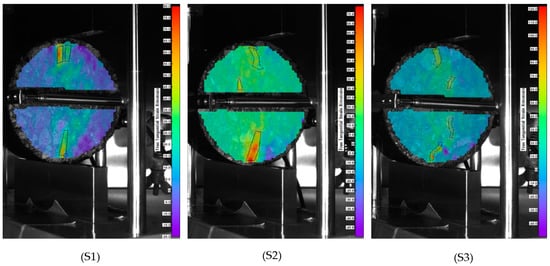 Horizontal strain map of the three samples at the termination cycle of the first step of the experiment calculated by Istra 4D, termination cycles: S1 = 6517, S2 = 2415, S3 = 3585.