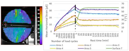 To investigate the healing, regions of interests around the areas with high strain where the microcracks exist were selected (Region 1 to Region 5 in Figure 6 (left)). Figure 6 (right) shows the mean horizontal strain inside the five specified areas during step 1 (the first fatigue test) and step 2 (rest time in elevated temperature). The temperature evaluation on the surface of the specimen is presented in Figure 6 (right). It can be seen that the strains in all the selected regions increase during step 1. After the test is stopped, it takes about 32 min for the mean horizontal strain to reach its minimum. The surface temperature at this time reaches approximately 54.7 °C. After this time the mean horizontal strain fluctuates around that minimum value.