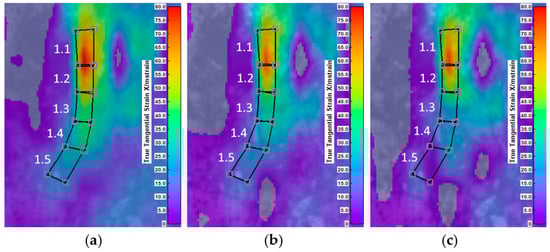 Figure 5 shows the horizontal strain map of the three samples, produced using the same asphalt mixture, at the termination cycle of the first step of the experiment calculated by Istra 4D. As expected, due to the difference between the module of elasticity of the aggregate and binder, the strain obtained within the binders is larger than those within the aggregates. However, after some cycles and before the appearance of any cracks, some locations with higher strain are observed on the surface. By continuing the fatigue experiment, the strain all over the surface increases but the location of the maximum strain remains the same. These are the locations where the cracks will initiate and grow. The increase of strain near the crack location in different steps of the fatigue test can be seen in previous research and is confirmed in this study [38]. It can be seen that the contour line of maximum strains matches very well with the fracture path. Due to the anisotropic characteristics of the asphalt mixture, the strain distribution and crack locations are closely related to the distribution of aggregates and the asphalt mortar (In this research mortar is defined as the mixture of bitumen, filler, and sand). The cracks are normally located at the interface of the aggregate-mortar matrix, but depending on the structure of the mixture, in some cases, the crack passes through the stones as well.