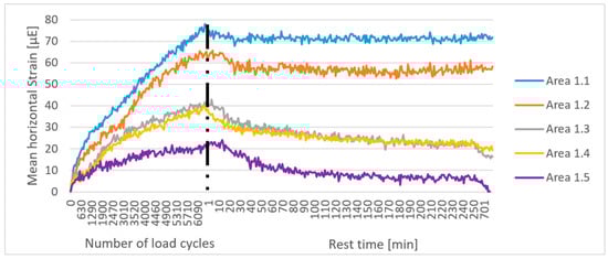 Next, to investigate the level of healing at different locations of a crack path, area 1 of Figure 6 is divided into five smaller areas (Figure 7), from the location with the highest strain (widest part of the microcrack) to the locations with lower strains (tip of the microcrack). Figure 8 shows that the mean horizontal strain is the highest in area 1.1 and it decreases towards area 1.5. Furthermore, the strain reduction is less than 8% in areas 1.1 and 1.2 but it gets to between 50% to 60% for areas 1.3 and 1.4 and finally 100% for area 1.5. Thus, it is possible to conclude that the microcracks can completely heal at their tip (area 1.5) where the faces of the microcracks are close to each other, but they heal much less in the places with a wider crack opening. This is in line with the primary step of the healing process known as wetting of the two faces of the cracks according to the models described in Reference [39]. It should be mentioned that in region 1.1 and 1.2 after the strain reaches a minimum, it slightly increases again until the end of the rest time. This could be due to the fact that there is still a loading plate left on top of the specimen that applies a small force in direction of the crack opening and the creep of asphalt in high temperatures.
