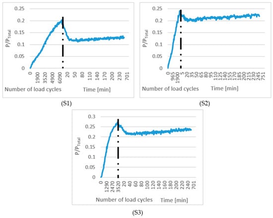 P/Ptotal calculated by digital image correlation (DIC) for three identical asphalt concrete specimens (S1–S3).