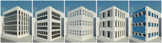 Visualisations of the five systems that were applied to a three-storey building. From the left: the Modular Intergraded Solar/Thermal Flat Plate Collector, the Hybrid Photovoltaic/Solar Thermal (HyPVT), the Concentrating Photovoltaic/Thermal Glazing (CoPVTG), the Solar Plenum and the Trapeze Flat-Plate Solar Thermal Collectors (FPSTC).
