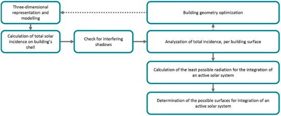 In the roadmap above, five design/research steps were proposed, which constitute a design process for achieving a system’s integration (Figure 2). The first step is a passive energy analysis of the building, or the cluster of buildings, at an urban level. The aim is to identify the ideal facade or facades within which the active system may be integrated with the least likely propagation of interfering shadows that could affect its performance.