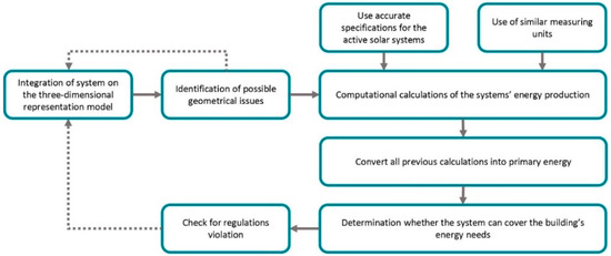 The basic methodological steps for the third step of the roadmap, which deals with the integration of the selected active solar system and the simulation of its energy production.