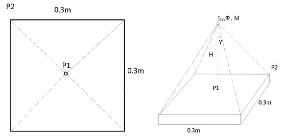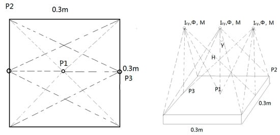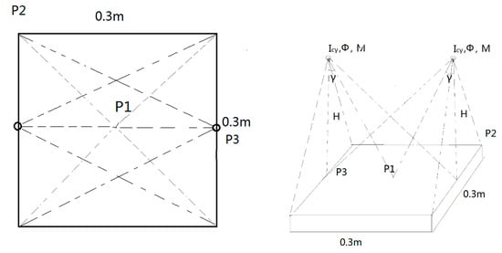 According to Equations (1) and (2), total illuminance of P1, P2, and P3 are calculated respectively. The calculation results are shown in Table 6 (unit, lx):
