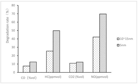 With the smaller particle size of 5 nm, the degradation effect of exhaust is better than the 10–15 nm size, especially for HC and NO’s degradation. The rest results will be presented for nano-TiO2 in particles size of 5 nm.