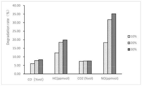 Nano-TiO2 emulsion (content of 5%) was added during the asphalt emulsification process. Among the emulsions, solid content nano-TiO2 emulsion dosages were 10%, 20% and 30% (a higher content of solid nano-TiO2 cannot be dispersed, and a lower dosage will lead to less photocatalytic effect). This section mainly investigated the exhaust degradation of different dosages of 5 nm nano-TiO2 added in the mixture. The test results of two hours are shown in Figure 7.