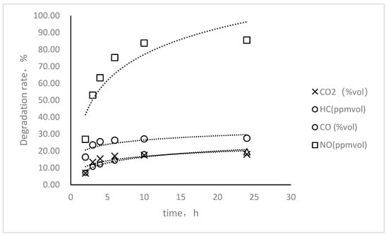 According to the properties of nano-TiO2 photocatalytic materials, nano-TiO2 will not decrease in the chemical reactions. In this section, as the degradation reaction time is prolonged, the main study target is on the changes of degradation performance on exhaust gas. The exhaust degradation test sustained 4 h. The xenon lamp configuration is Scheme B, and the particle size is 5 nm. The test results are shown in Figure 8.