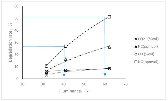 The photocatalytic material nano-TiO2 is added in the asphalt pavement. Ultraviolet irradiation is needed as an elementary condition for the degradation reaction. In this section, we continue to use the Section 3.2. light source arrangement; various numbers of xenon lamps were designed to simulate different light intensity to achieve different luminosity on the impact of exhaust degradation. The tests lasted 2 h. The degradation rates of the four kinds of harmful exhaust gases at different light intensities are shown in Figure 9.