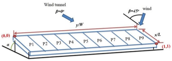 The experiments were performed in a closed-loop wind tunnel at the Architecture and Building Research Institute (Tainan, Taiwan). The wind tunnel has a working cross section of 2.6 m (height) × 4 m (width) × 36.5 m (length) and a contraction ratio of 4.71. To determine the critical wind loads, a 1/10 scale stand-alone array (nine inclined panels, P1–P9; L = 168 mm and W = 900 mm) was constructed, as shown in Figure 1. The origin of the coordinates (x/L = 0 and y/W = 0) is located at the upper left corner of the inclined plate. When the low surface faces the flow, this corresponds to β of 0°. The lift coefficient, CL, is negative in the upward direction. The model sits 10 mm above the tunnel floor and the blockage ratio is up to 1.4%.