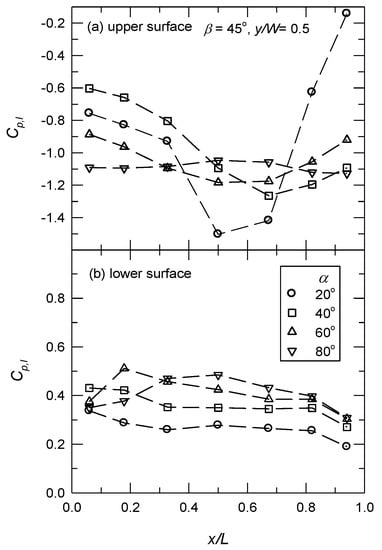 The Cpl distributions for β = 30°at y/W = 0.5 are shown in Figure 3. On the upper surface, the distributions were flat for α = 40°, 60°, and 80° but not for α = 20°. The value of Cpl decreased significantly for the second half of the inclined array. On the lower surface, the Cpl distributions were similar to those for β = 0°. The values for Cpl were lower for β = 30°. For β = 45°, Kopp et al. [22] observed the peak system torque at angles for approaching wind that are close to the angle of the diagonal axes of an inclined panel. Figure 4 shows that the variation in Cpl on the upper surface was more significant at lower values of α. The lowest value of Cpl was observed at x/L = 0.5–0.7 for α = 20°, 40°, and 60°. This corresponds to the formation of the windward corner vortex. An increase in the value of β resulted in a decrease in the value of Cpl on the lower surface. For β = 135°, Figure 5 shows that the flow decelerated along the longitudinal direction on the upper surface. An increase in α produced a more positive value for Cpl on the upper surface and a more negative value for Cpl on the lower surface. The sectional lift coefficient increased as α increased; hence, there is a greater downward force.