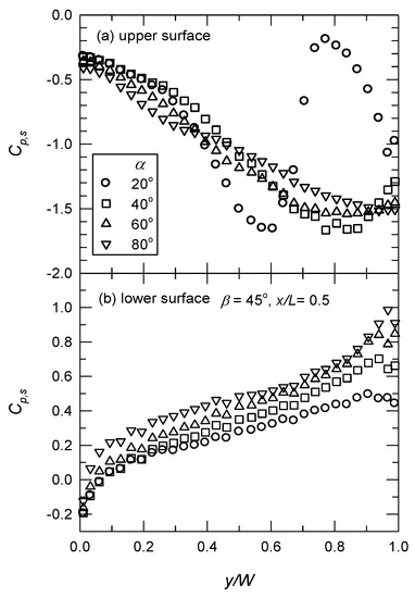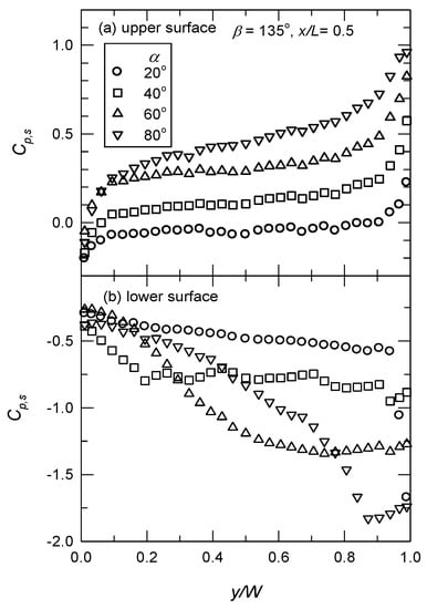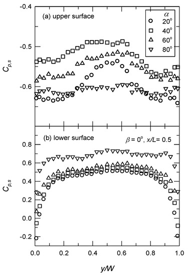 For x/L = 0.5, the spanwise pressure, Cps, distributions for β = 0° are shown in Figure 6. On the upper and lower surfaces, there was an inverted U-shape for α = 20°, 40°, and 60°, which corresponds to side-edge vortices. This agrees with the results for an inclined panel for which L/W = 2 [21]. Therefore, the side panels (P1 and P9) experienced greater suction on the upper surface and less lift force on the lower surface. For α = 80°, the distributions were quite flat. The difference in the pressure between the upper (highly separated flow with lower value in Cps) and lower surfaces (near stagnation region with greater value in Cps) was greater than that for α = 20°, 40°, and 60°.