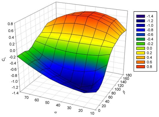 Figure 12 shows the effect of β on CL for α of 0°–80°. For β ≤ 30°, the value of CL decreased as α increased (≥ 20°). For β = 75°–105°, the value of α had a less significant effect. This agrees with the results of Chou et al. [21]. The value of CL for β ≥ 120° decreased as α (= 40°–80°) increased, and the opposite was true for α =10°–30°.