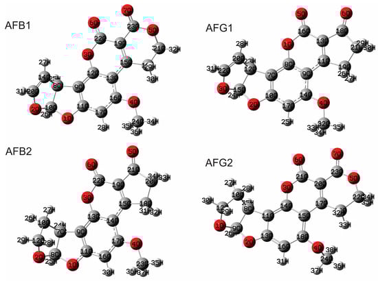 The geometrical parameters of AFB1 are described in Table 1. These parameters were calculated using two methodologies: B3LYP/6-311G(d,p) and M06-2X/6-311G(d,p) (see the Supplementary Information). Afterwards, the resulting bond distances and angles were used to evaluate which of the two approximations adjusted the best to the experimental data. Table 1 shows correlations up to 0.99 for bond distances in the gas and solvent phases. For bond angles, the correlations were better in the gas phase than in the solvent phase, with values up to 0.97 in the gas phase. Based on these results, it was decided to work with the two functionals in combination with the same basis set, as both methodologies presented a correct description of the molecular structure of aflatoxins. The absence of imaginary frequencies confirmed the global minima in the potential energy surface. The optimized structures of the aflatoxins were used for the remaining calculations. Figure 2 shows the optimized structures of aflatoxins calculated with B3LYP/6-311G(d,p) in the gas phase.