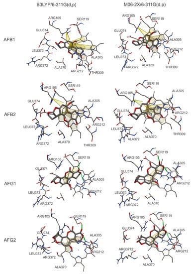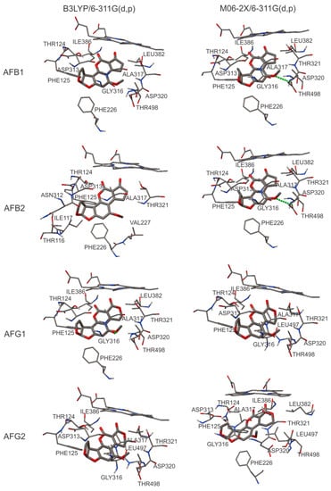 Table 2 summarizes the outcome of the dockings between the aflatoxins B1, B2, G1, and G2 with the protein CYP3A4. The docking results between 1TQN and the AF were used to analyze the main differences in the active site, as different methodologies were used in the initial geometry optimization of the aflatoxins (see Scheme 1). The computations showed no significant differences when using the functional M06-2X or B3LYP in the determination of the AF molecular geometries. However, the results of the binding energy indicated that this energy was more stable when the M06-2X functional was used.