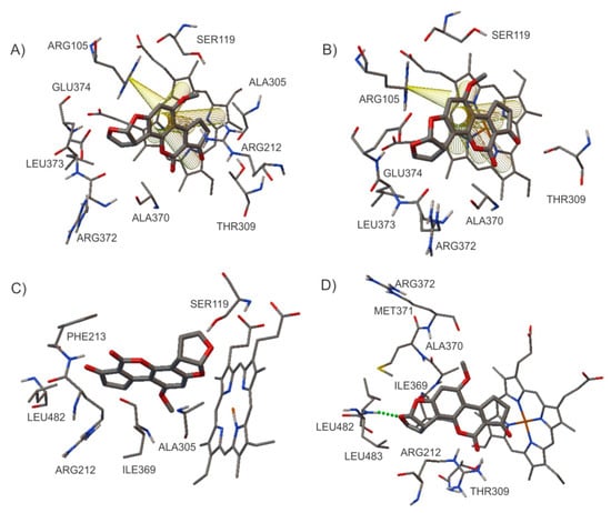 Analysis of the molecular interactions between aflatoxin AFB1 and CYP3A4 (using different PDB ID files): (A) 1TQN, (B) 2V0M, (C) 1W0E, and (D) 4NY4. π–π interactions are indicated as yellow tubes and hydrogen bonds are indicated with green dotted lines.