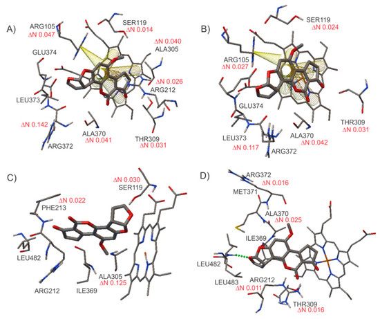 Schematization of the transferred electron values (ΔN) calculated for the interactions between AFB1 and the CYP3A4 protein. (A) ITQN, (B) 2V0M, (C) 1W0E, and (D) 4NY4. Values in red indicate electron donors.