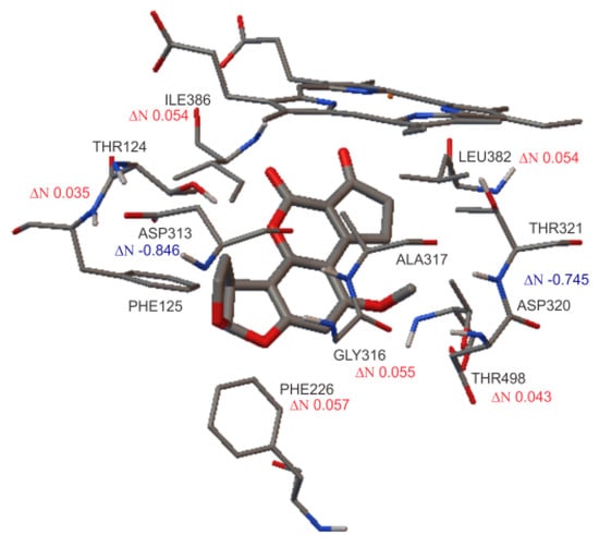 It is important to note that each PDB file presented different conformations inside the active site. As mentioned in the Section 2.4, positive values of ΔN indicate that the compound is an electron donor, while negative values indicate that the compound is an electron acceptor. As noted in Table 6, all the calculated values of ΔN using different PDB IDs are positive, which means that once the ligand is inside the active site, it acts as an electron acceptor, while the protein residues behave as electron donors. These ΔN values could highlight the oxidative process involved in the chemical reaction occurring inside the active site. Figure 6 shows the calculated ΔN of each residue of CYP3A4 when they are in contact with the ligand AFB1.