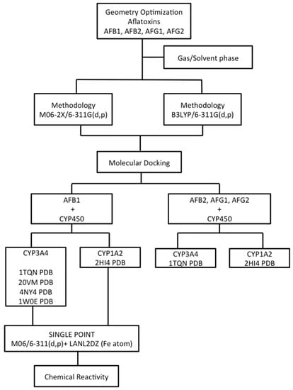 In this work, the geometry optimization of the aflatoxins BI, B2, G1, and G2 with two different theoretical methodologies is reported. These geometries were used for molecular docking analysis, predicting the possible electrostatic interactions, the amino acids of the active site, and the binding energies with two proteins: CYP3A4 and CYP1A2. AFB1 was analyzed with several PDB IDs for CYP3A4 to identify the main differences in the active site of the crystallographic structures of the protein. Afterward, single point energy calculations were performed in order to obtain the chemical reactivity parameters. The ionization potential (I), the electron affinity (EA), the chemical potential (μ), and the chemical hardness (η) were used in the determination of charge transfer in the oxidative process of AFB1 inside the protein. The calculation pathway used for quantum chemical calculations and molecular docking analysis is shown in Scheme 1.