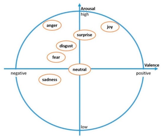The automatic speech emotion recognition (SER) system needs an appropriate model to represent emotions. Human emotions can be modelled via the categorical approach, dimensional approach, and appraisal-based approach. In the categorical approach, emotions are divided into emotion categories: anger, happiness, fear, sadness, and so on. In the dimensional approach, emotions are represented by three major dimensions: valence (how positive or negative), arousal (how excited or apathetic) and dominance (dominant or submissive) [1,2]. Figure 1 illustrates seven basic emotions in arousal-valence dimensions [2].