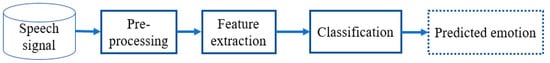 To automatically recognize emotions from a speech signal, there must be an SER system. The traditional SER system consists of three major parts, including pre-processing, feature extraction and classification, as shown in Figure 2.